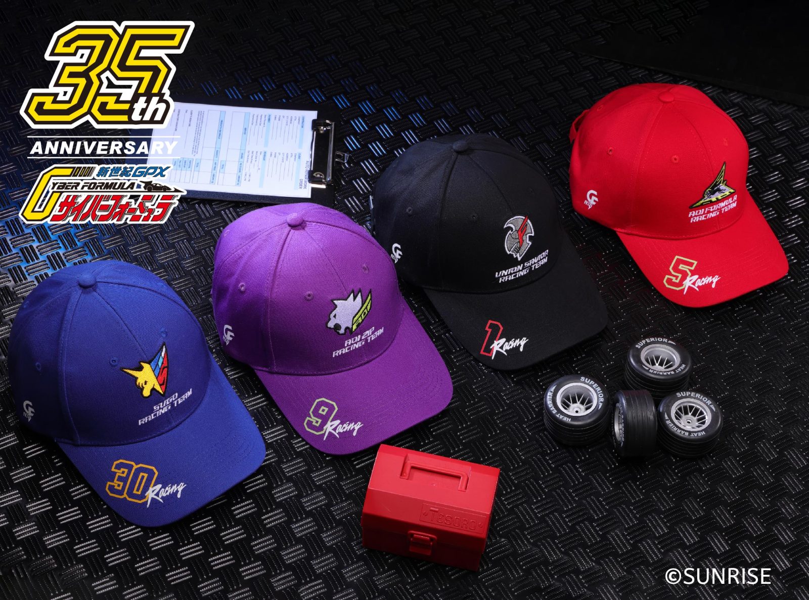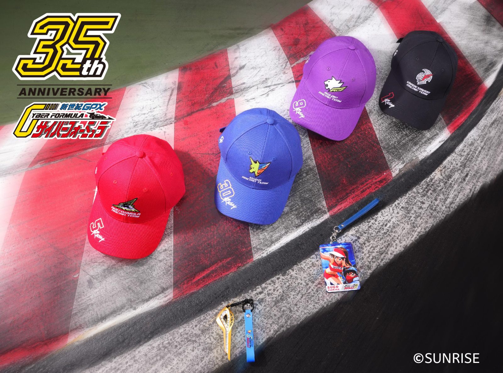 - 潮流車隊刺繡鴨舌帽:以四大車隊(SUGO、AOI ZIP、AOI FORMULA、UNION SAVIOR)配色與隊徽設計,結合精緻電繡工藝,成為動漫迷日常穿搭的潮流單品。
